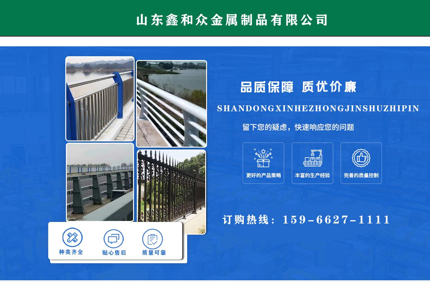 山东鑫和众金属制品有限公司主要产品有防撞护栏,桥梁护栏,道路护栏,河道护栏,不锈钢护栏等护栏。提供设计方案,一站式定制,包您满意价格优惠,欢迎来电咨询! 公司常年从事销售护栏防撞护栏,桥梁护栏,道路护栏,河道护栏,不锈钢护栏,桥梁钢护栏,河道灯光护栏等。产品广泛应用于桥梁、河道、旅游景区、道路、公路、公园、小区、景观、道路防撞等领域?! 」静肪捎糜胖什恍飧植牧?,符合相关标准。各种型号不锈钢复合管及护栏,质量严格把控。产品强度高、耐腐蚀、焊接牢固、抗冲击、性能好,防撞护栏结构简单、美观实用大方?! 』队袄炊┕海?..
